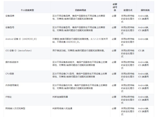 收集个人信息的类型:设备信息、地理位置、网络信息